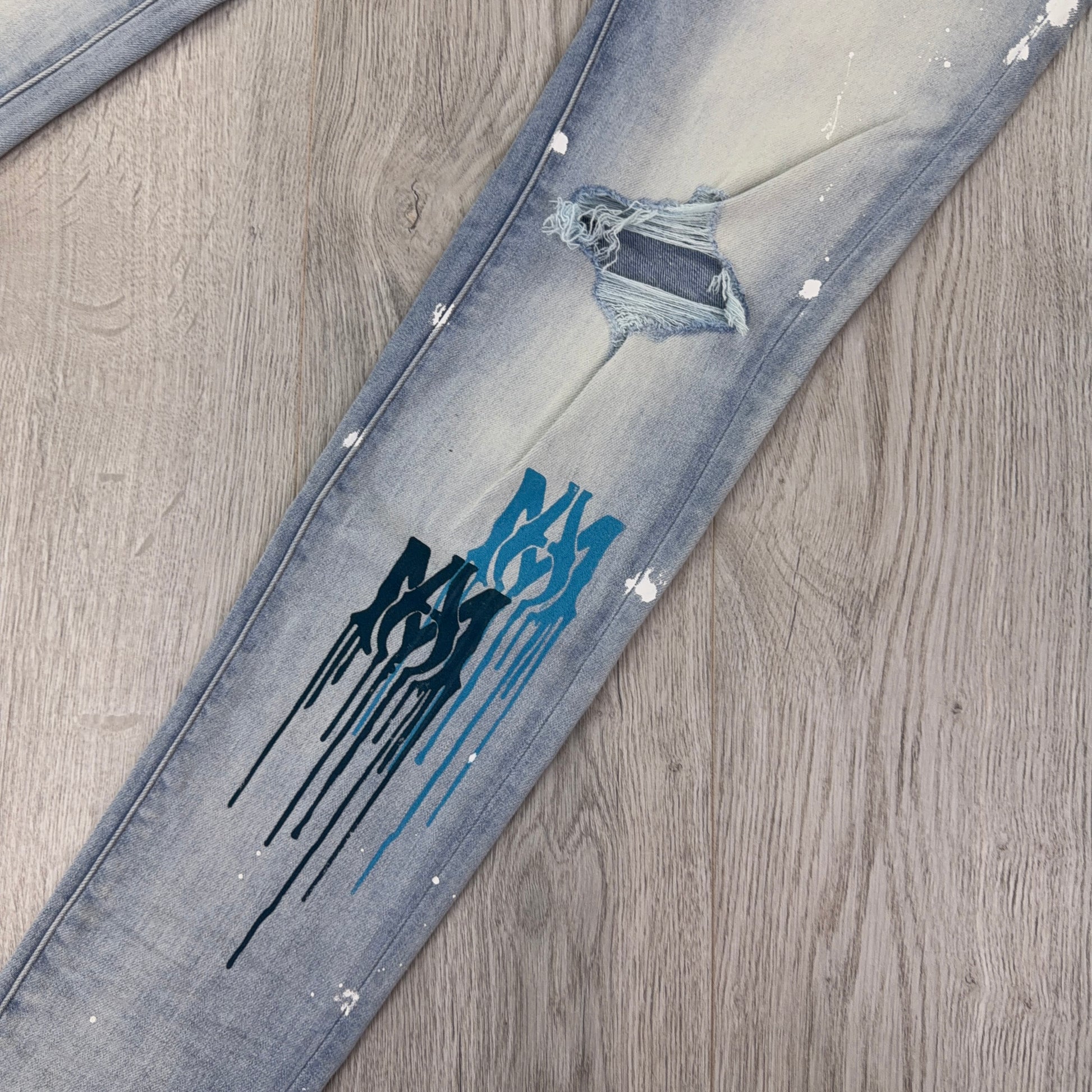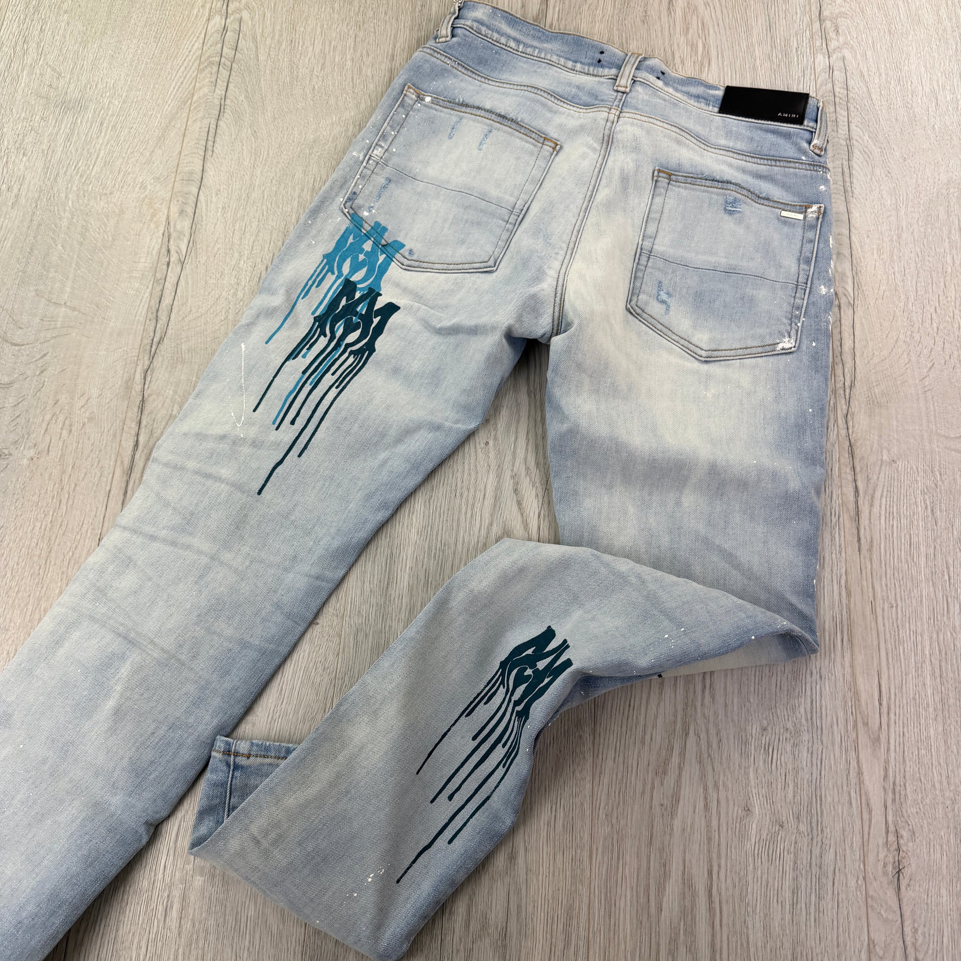 Amiri Men’s MX1 MA Logo Drip Blue Distressed Jeans