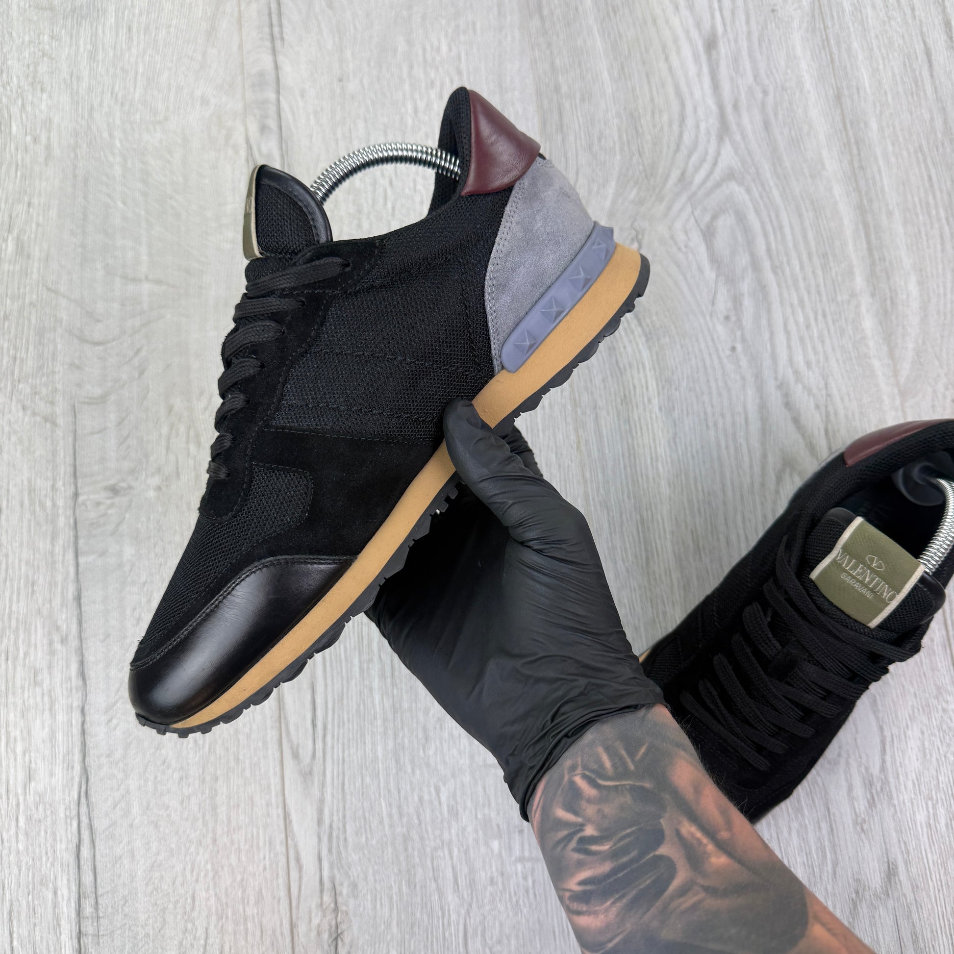 l• Valentino Men’s Black Mesh Runners With Maroon Heel • Pre-loved condition with few minor scratches (no box) • Retail £580 •